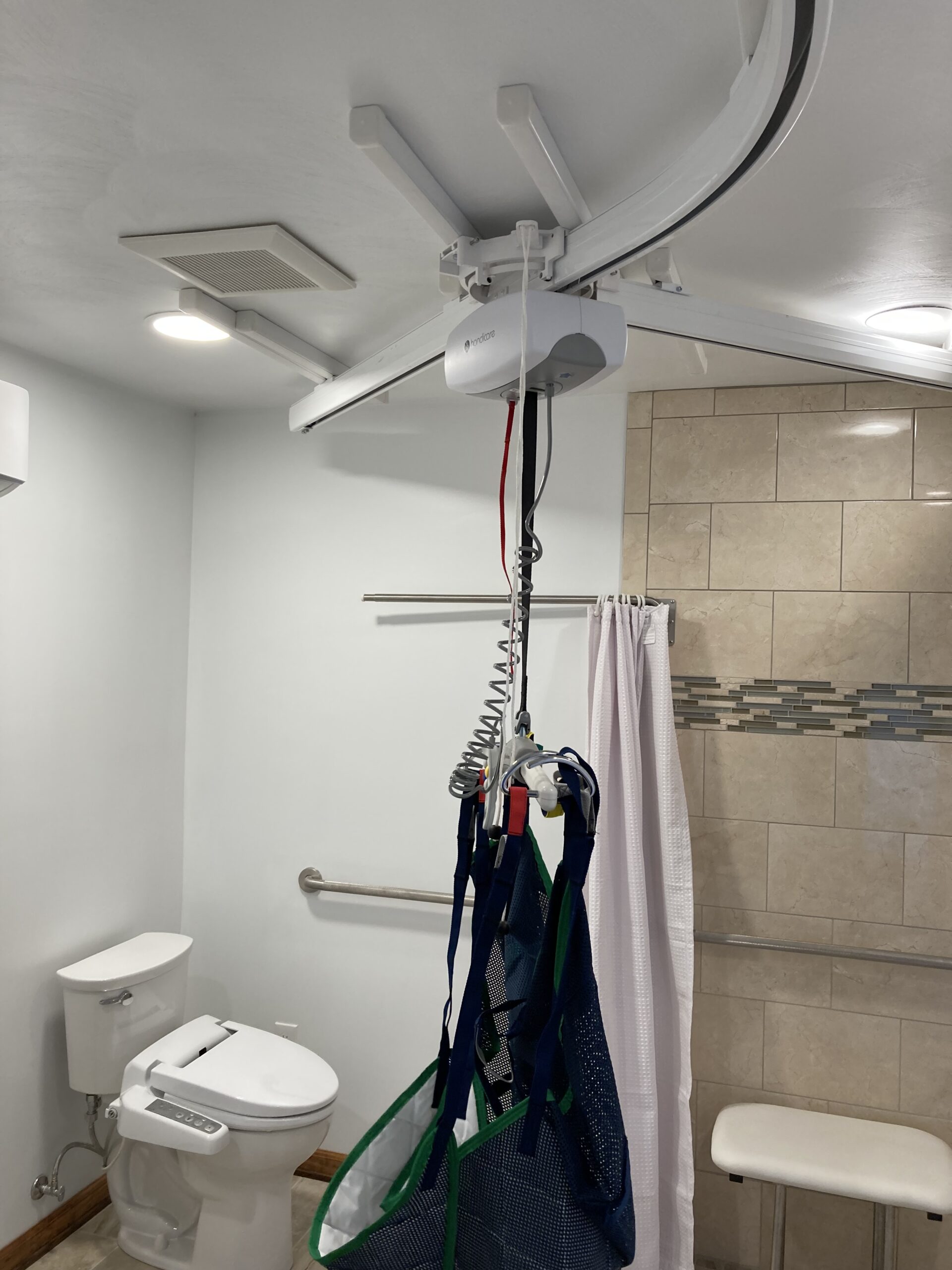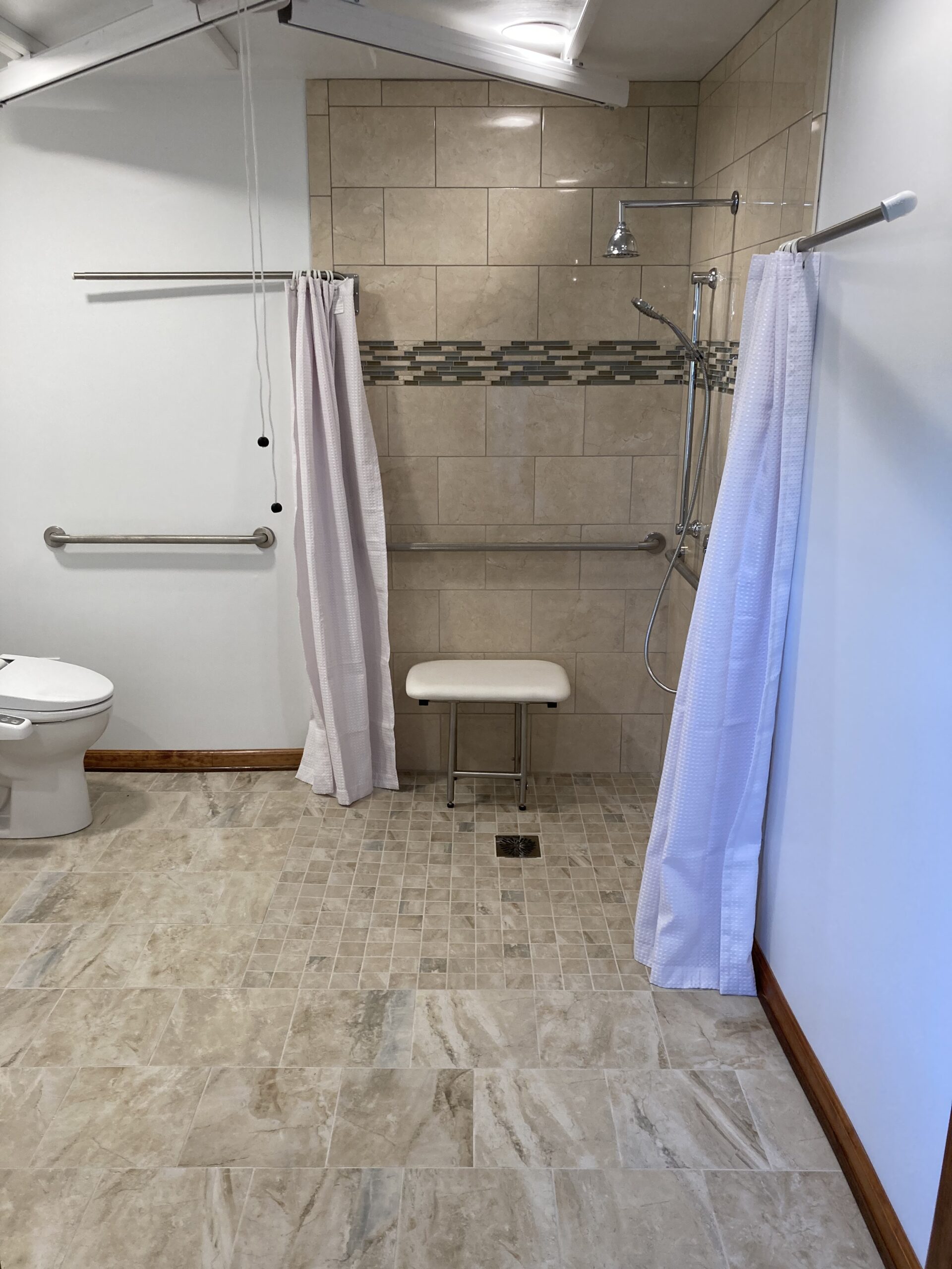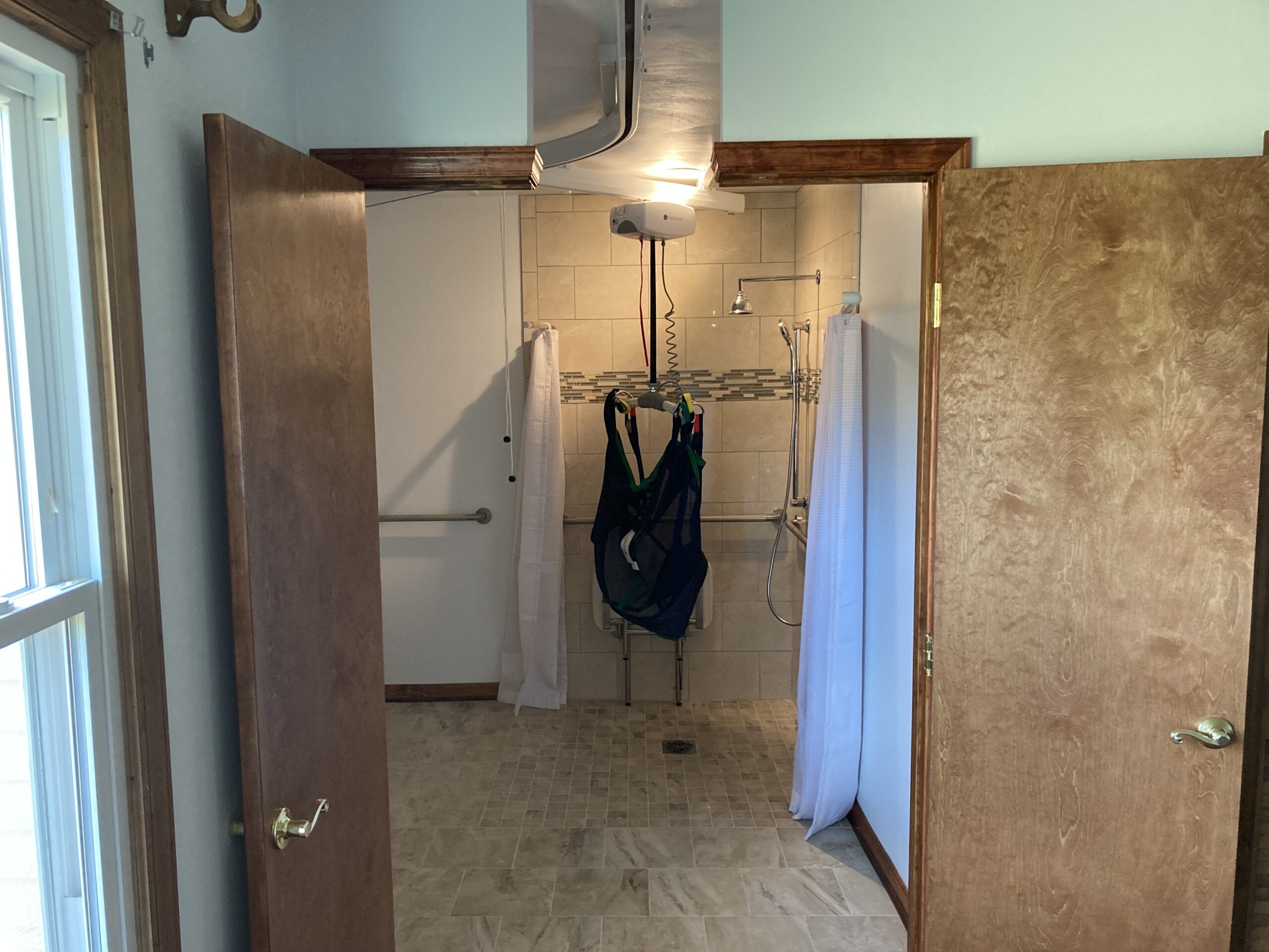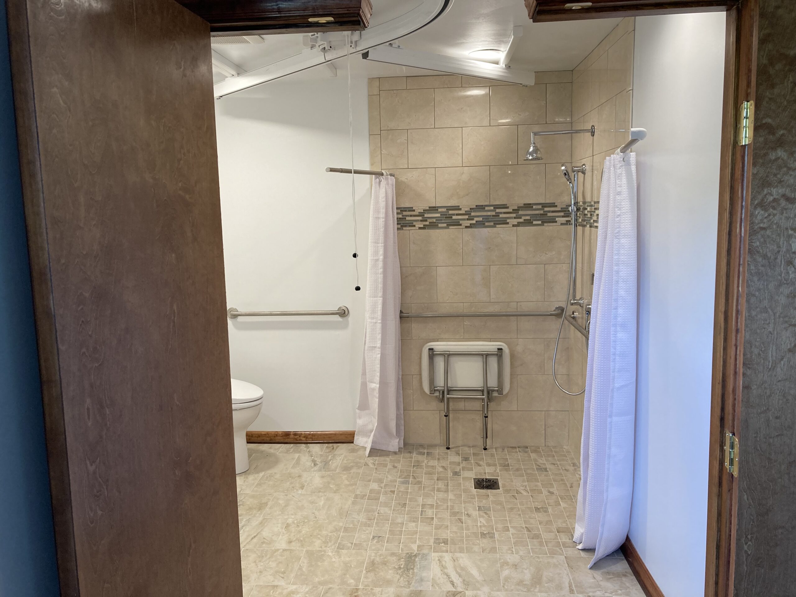 This job we completed for a veteran using the SAH Grant. We created a small addition to the bathroom to make it larger, and we created a curbless tile shower with a fold down shower seat, a rain head shower head, and a handheld shower head. We installed a comfort height commode and roll-under sink. The bedroom/bathroom we installed a ceiling lift so the veteran could easily access both areas. We installed an exterior door, deck landing, and ramp in the bedroom so the veteran could have a 2nd wheelchair accessible entry/exit.