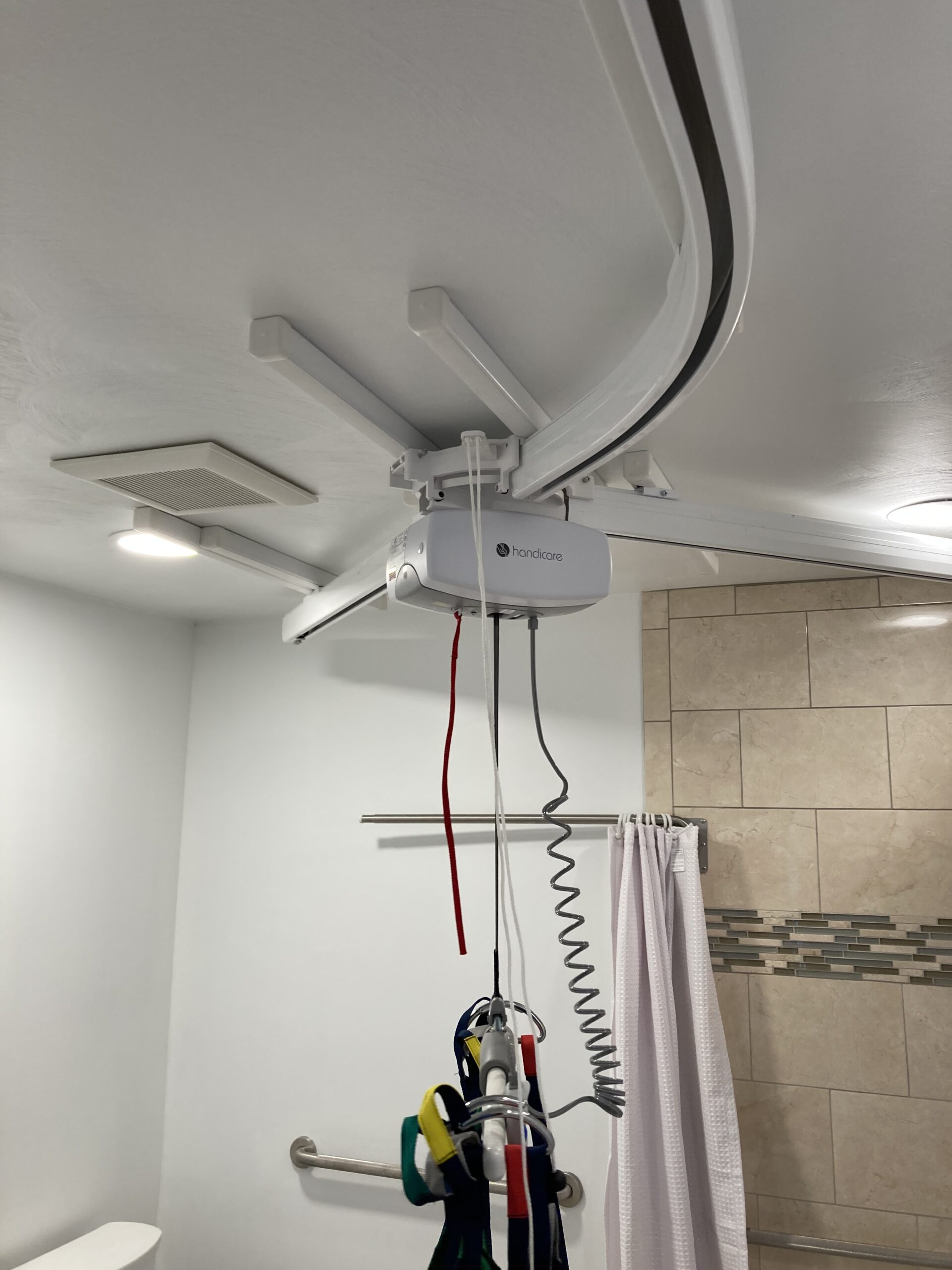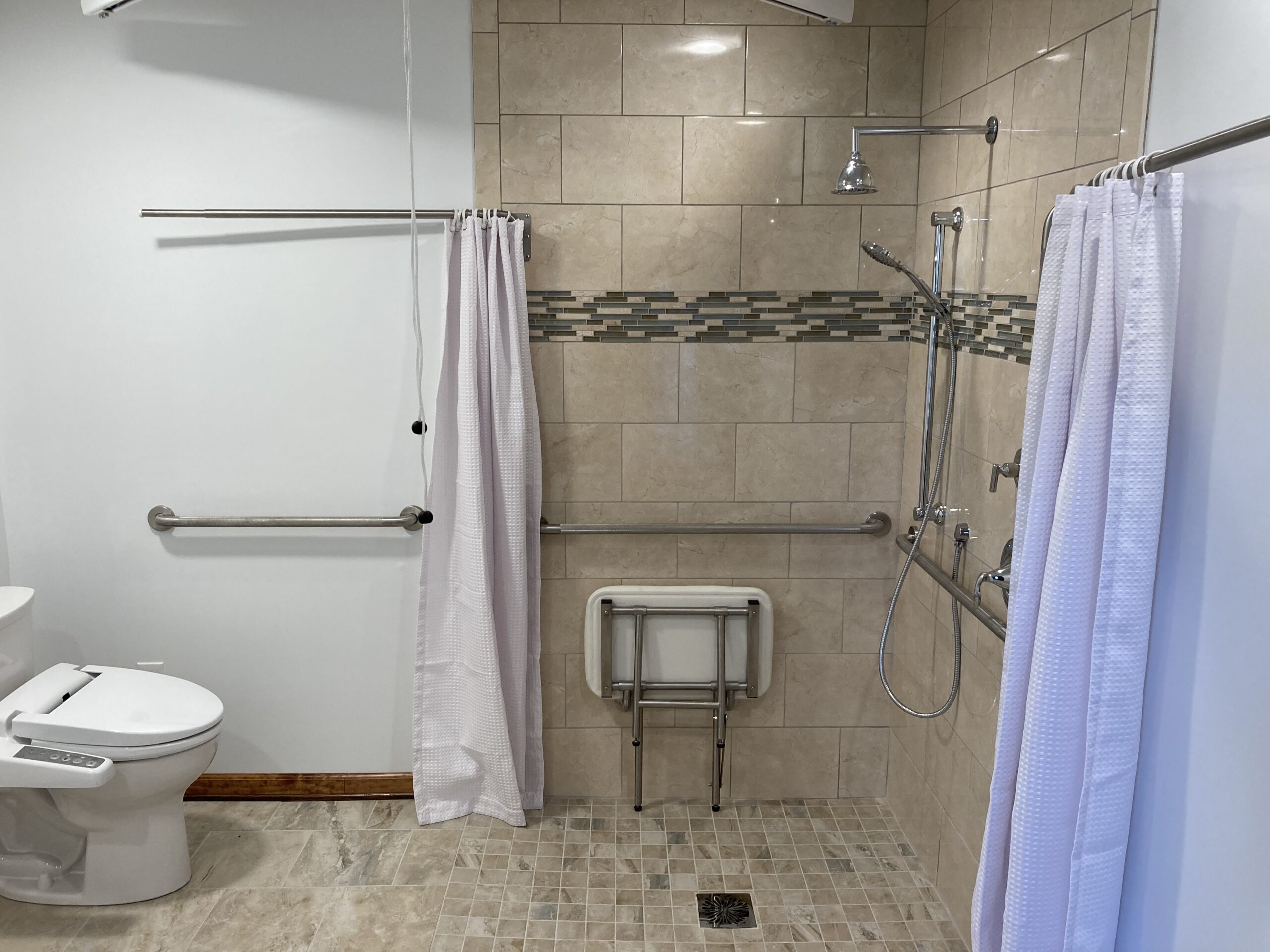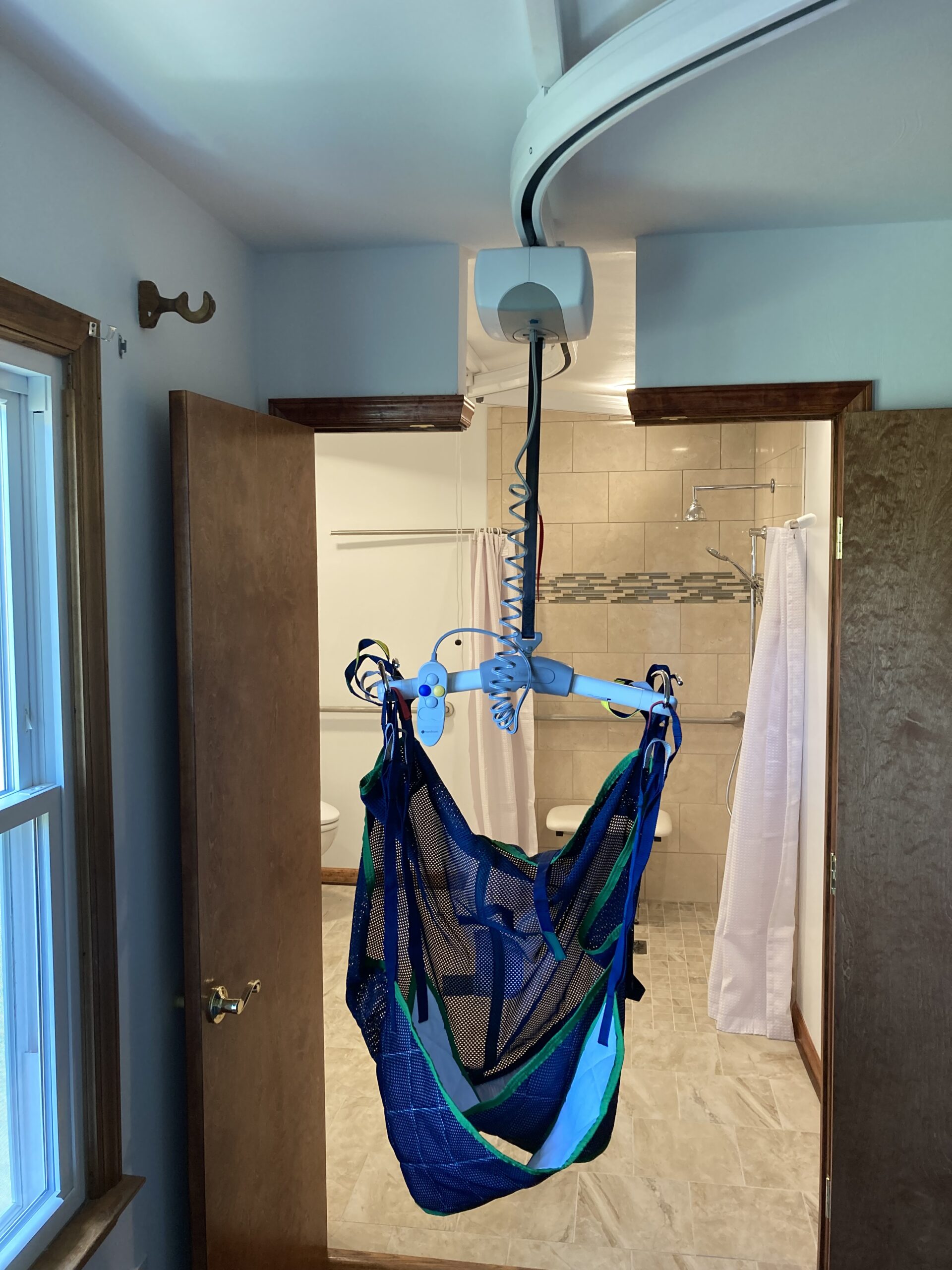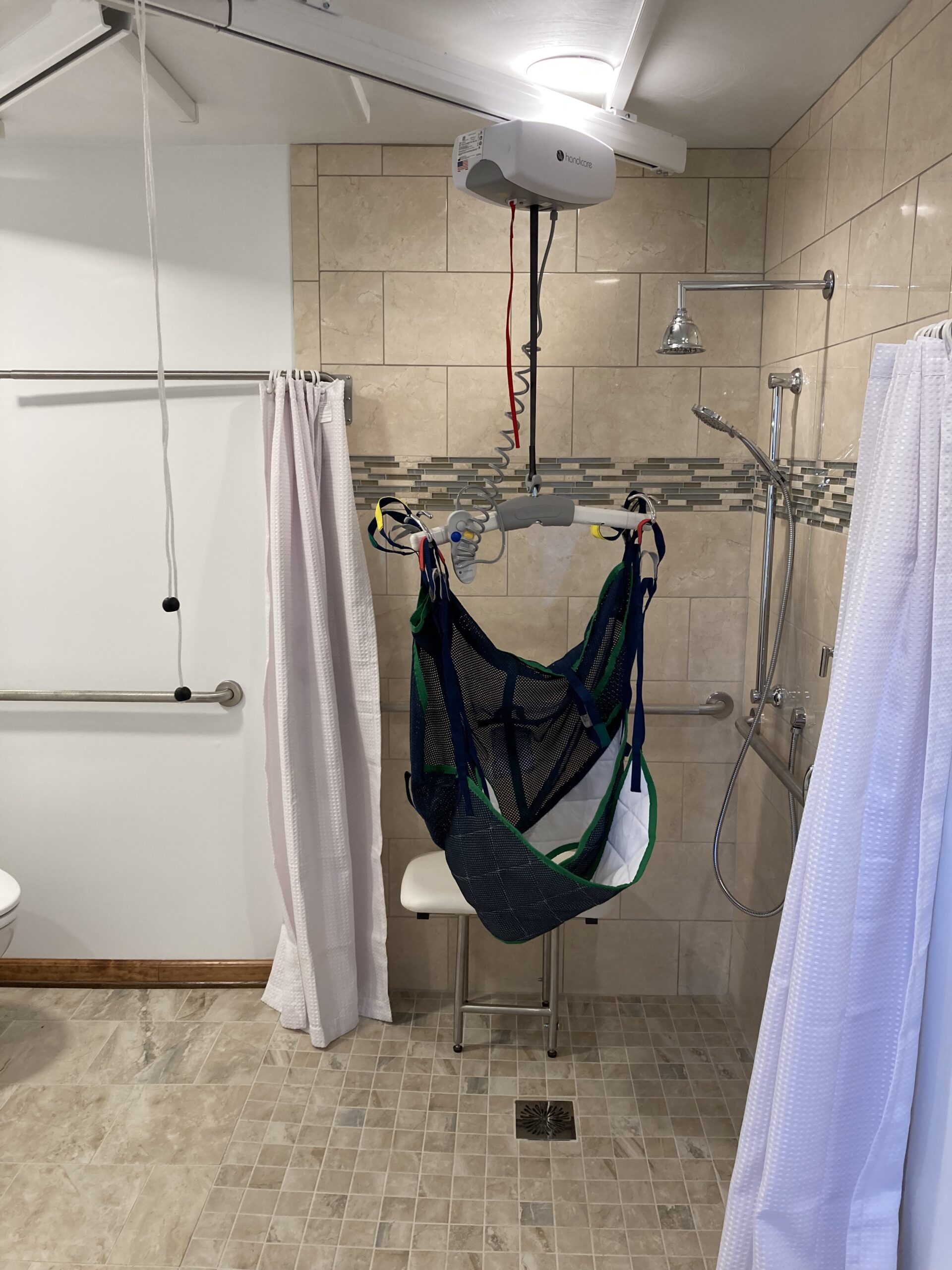 This job we completed for a veteran using the SAH Grant. We created a small addition to the bathroom to make it larger, and we created a curbless tile shower with a fold down shower seat, a rain head shower head, and a handheld shower head. We installed a comfort height commode and roll-under sink. The bedroom/bathroom we installed a ceiling lift so the veteran could easily access both areas. We installed an exterior door, deck landing, and ramp in the bedroom so the veteran could have a 2nd wheelchair accessible entry/exit.