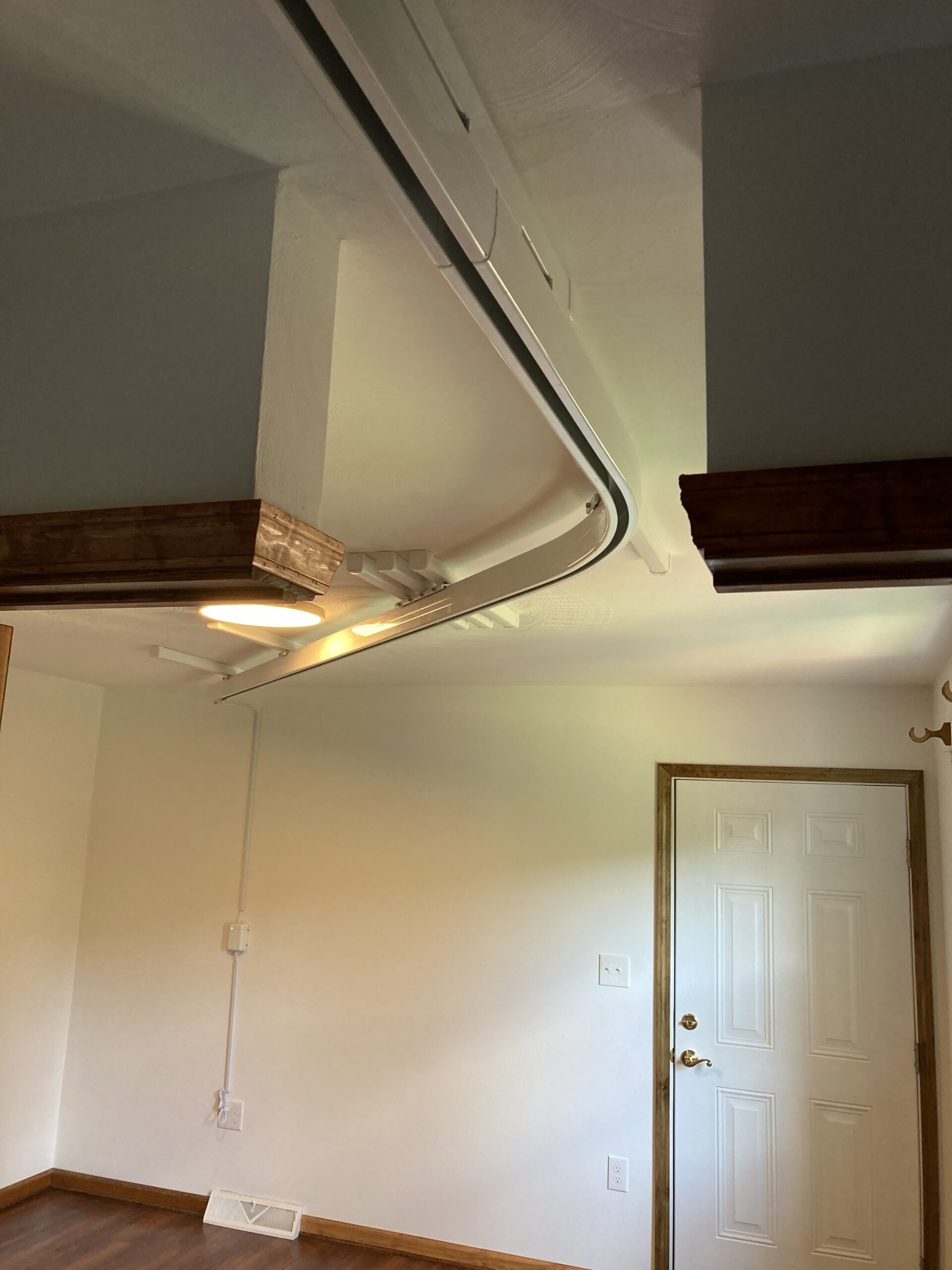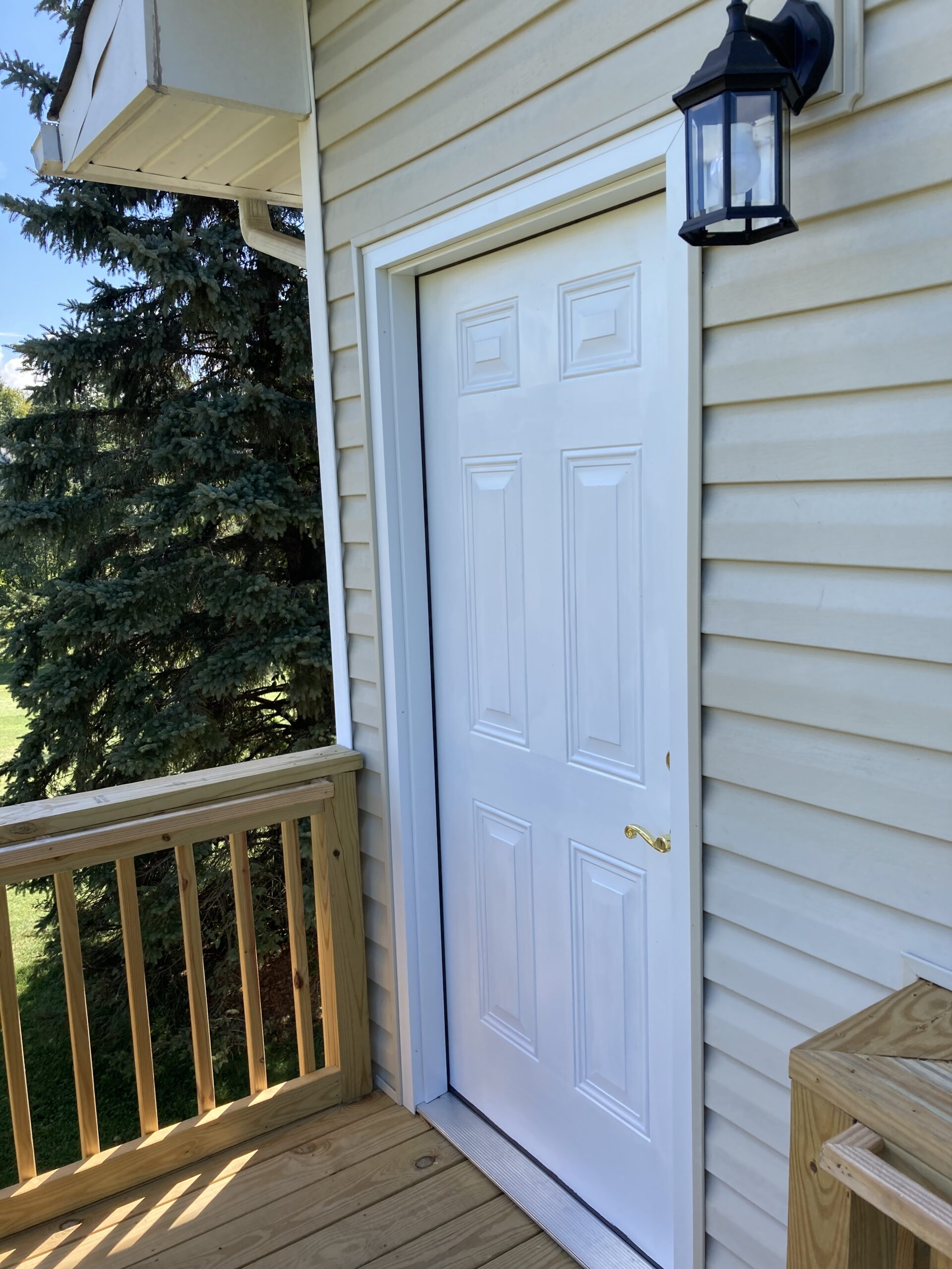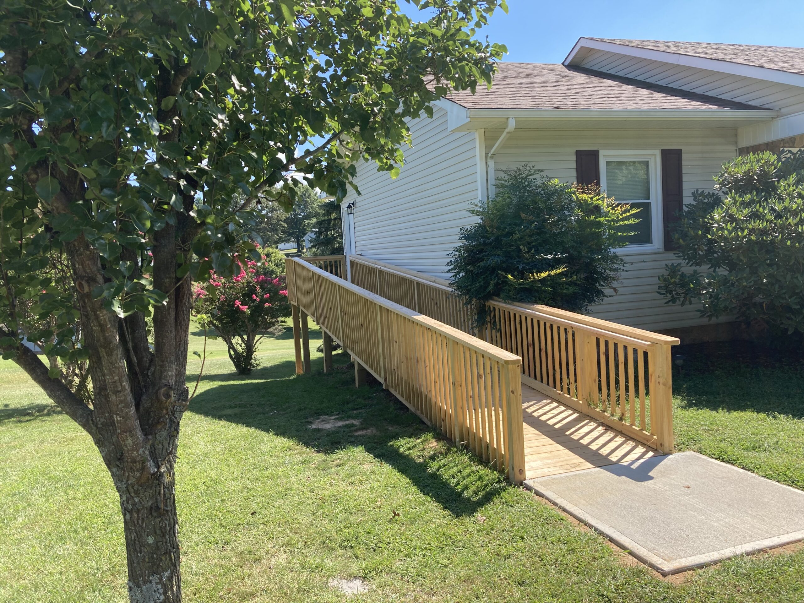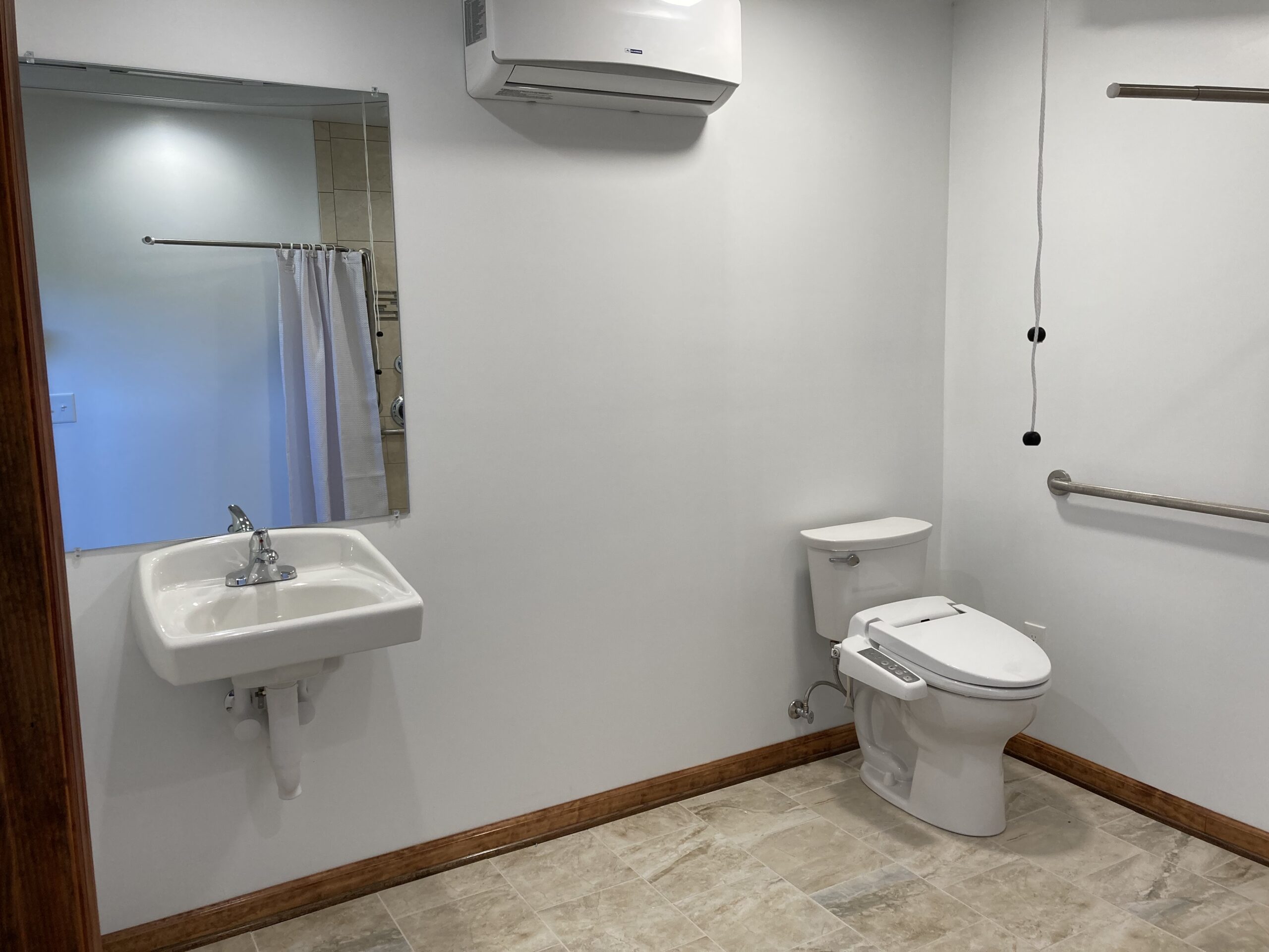 This job we completed for a veteran using the SAH Grant. We created a small addition to the bathroom to make it larger, and we created a curbless tile shower with a fold down shower seat, a rain head shower head, and a handheld shower head. We installed a comfort height commode and roll-under sink. The bedroom/bathroom we installed a ceiling lift so the veteran could easily access both areas. We installed an exterior door, deck landing, and ramp in the bedroom so the veteran could have a 2nd wheelchair accessible entry/exit.