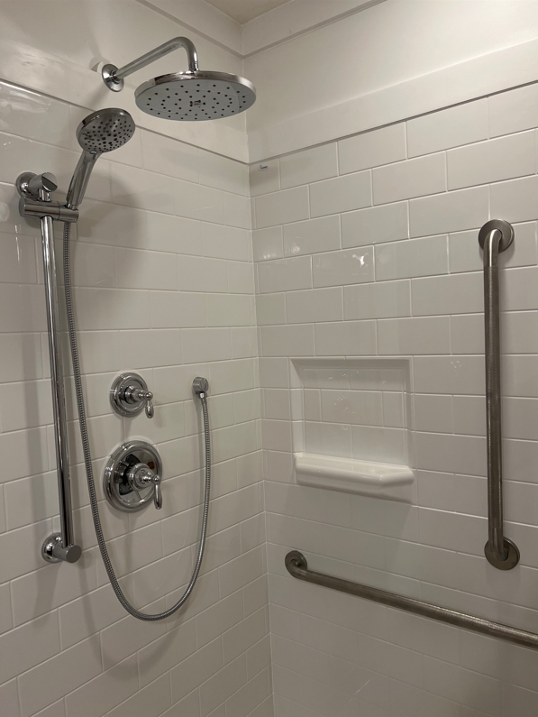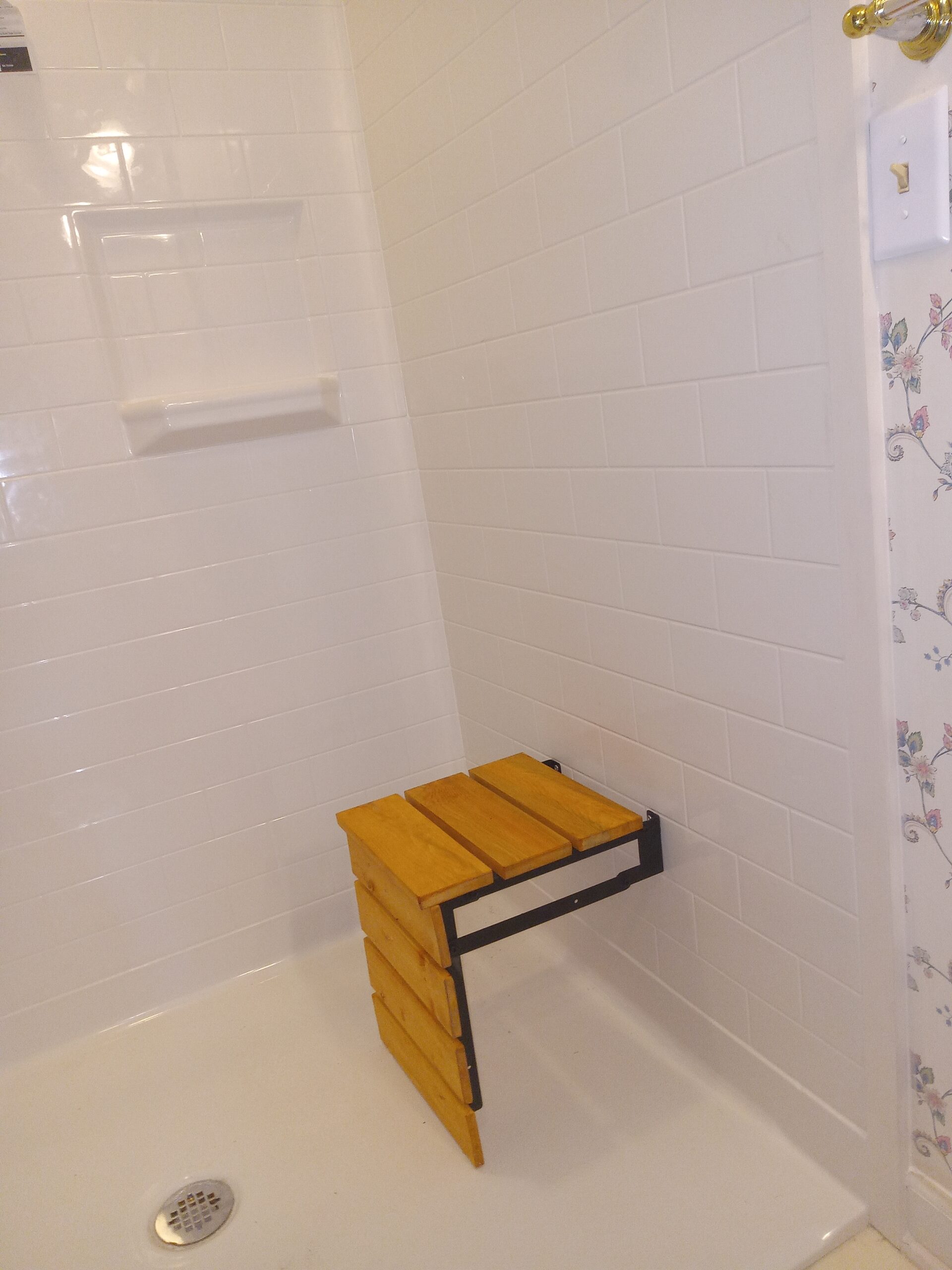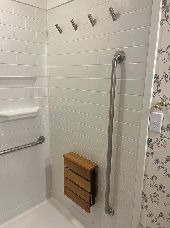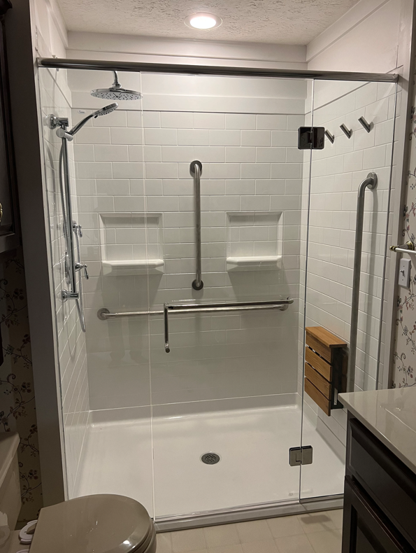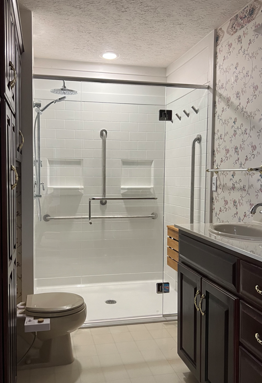 This clients wife was having mobility issues and had a very hard time getting in the shower. We removed the existing bathtub and installed a curbless shower with a handheld shower head on a slide bar, two grab bars, and a fold down shower seat. We also installed  a fold down grab bar with a leg. This allows for easier accessibility while in the shower and then the grab bar can be folded up and out of the way to get in/out of the shower or when not in use.